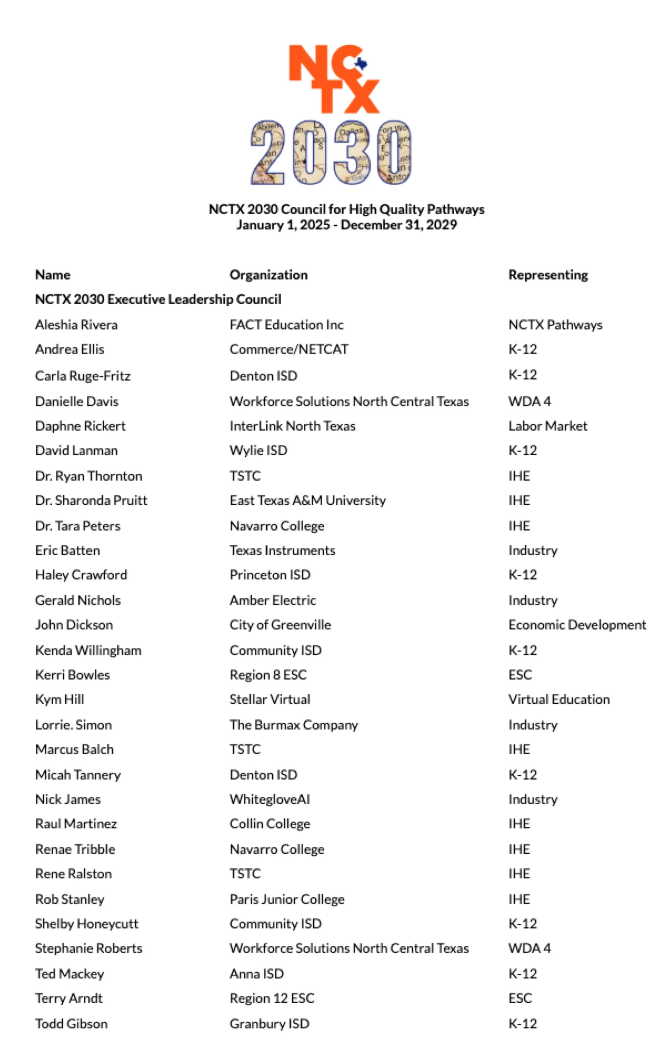 The North Central Texas Council for High Quality Pathways, guided by FACT Education Inc., Regional Convener for North Central Texas, plays a pivotal role within the Texas Regional Pathways Network (TRPN). This council is dedicated to nurturing talent pipelines essential for driving economic growth across North Central Texas. Through cohesive collaboration, the council aims to ensure that every student in the region acquires the necessary skills and qualifications to thrive in high-demand industries. By bringing together leaders from K–12 education, postsecondary institutions, workforce development, businesses, government bodies, and community-based organizations, the council is committed to empowering individuals with the competencies needed for success. The North Central Texas Council for High Quality Pathways focuses on creating robust educational and career pathways, fostering personal growth, and contributing to the vibrant fabric of the local community and beyond.